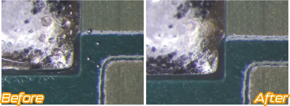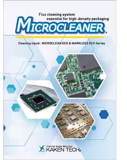 Flux cleaning, that is essential for high-density packaging.In the midst of tightening regulations on chemical substances, such as the discontinuation of production of HCFCs and the addition of GB standards for cleaning agents to China's VOC regulations, KAKEN TECH has developed the MICROCLEAN ECO & MARKLESS ECO Series, high-performance, low-VOC cleaning liquid that combine even higher precision cleaning with environmental friendliness.