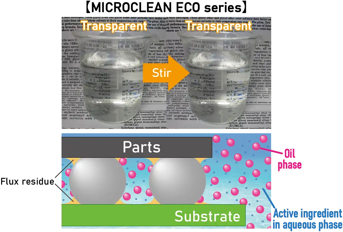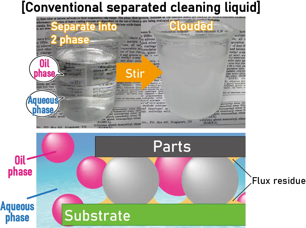 KAKEN TECH's conventional low-VOC cleaning liquids effectively clean flux residues with components that are phase-separated into an oil phase and an aqueous phase. The newly developed MICROCLEAN ECO-8100U miniaturizes the oil phase to nano size, and powerfully removes flux residue in narrow gaps that cannot be removed by conventional cleaning liquid.