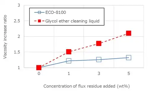 ECO-8100/ECO-R81 can be applied to electronic components and materials in general without any particular restrictions because it has little effect on resin and metal components used in substrates. In addition, because of its excellent solubility in metal salts and resin components, it has sufficient cleaning power for water-soluble fluxes and fluxes for lead-free soldering.