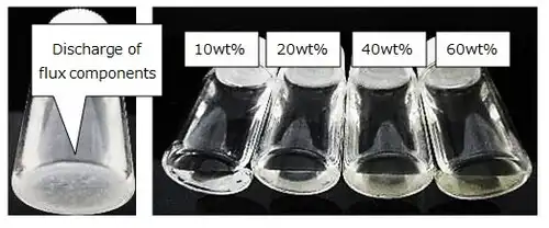 Fig. 9 shows a photograph of the appearance of ECO-8100 compared to a non-separable type of high water content cleaning liquid consisting of glycol ether, water, and cleaning aid, as well as a glycol ether-based cleaning agent and its flux dissolving power. 3 wt% of rosin flux residues were added to each cleaning liquid, dissolved and dispersed by ultrasonic irradiation, and then left to stand at a liquid temperature of 25°C to check its appearance. In the case of the high water content cleaning liquid that does not have a phase separation structure, the main resin component in the flux residue is not fully dissolved in the liquid and is ejected, resulting in suspension and precipitation (Fig. 9, right), whereas ECO-8100 (left) maintains a uniform transparent state without suspension just like the glycol ether cleaning liquid (center) and the difference in solubility is obvious.