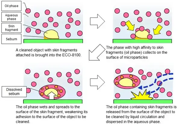 It has also been found that the presence of numerous fine hydrophobic regions in the aqueous phase due to the microphase separation structure is effective in removing all types of particles. Fig. 12 shows the cleaning mechanism of the ECO-8100 for organic particles (sebum + skin fragments) originating from the human body, which are particularly difficult to remove among particles.