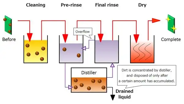 On the other hand, our cleaning system "MICROCLEANER", which uses ST-05 as a rinse liquid, has a built-in small distiller that enables stable distillation and regeneration without changing the composition of ST-05, which is a non-azeotropic mixed liquid containing hydrous alcohol. As shown in Fig. 4, the dirty liquid in the pre-rinse tank becomes clean distillate through distillation and flows to the final rinse tank, leaving the dirt concentrated in the distiller. When the liquid level in the final rinse tank reaches a certain level due to the supply of distillate, it overflows into the pre-rinse tank. Through this repetition, the ST-05 is completely recycled in closed system, and can continue to maintain a high level of cleanliness. The amount of waste liquid is much less than that of the water rinse method because only the liquid in the distiller, which contains highly concentrated flux residue and contaminants such as detergent components, becomes waste liquid.