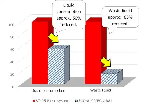 ECO-8100/ECO-R81 are both composed of about 70% water, which means that the total amount of VOC emissions due to volatilization and drying can be reduced to about half while maintaining the same level of cleaning quality as the conventional ST-05 rinse system.