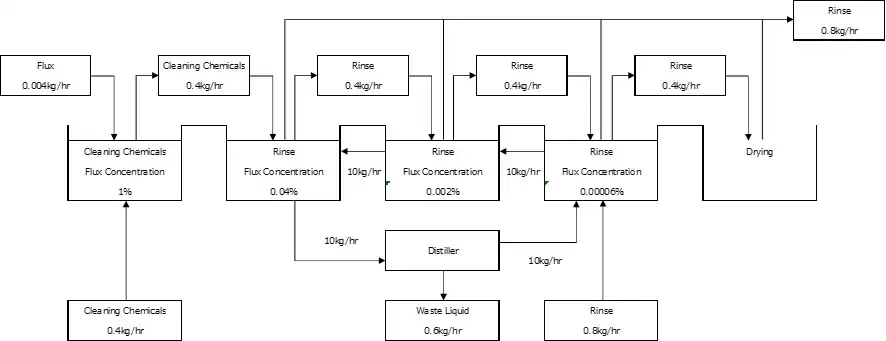 Either with water or water content alcohol, quality discrepancy such as drying failure and post-cleaning tarnish arises as the concentration of cleaning chemicals and flux residue increases in the finishing rinse tank. Accordingly designing the most suitable equipment for long-term operation including the recycle and retrieval process is of the essence, based on the trial calculation of material balance in cleaning at the upper limit of contamination concentration for long-term use.