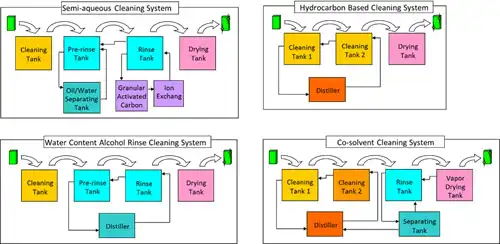 The system with cleaning chemicals mainly composed of hydrocarbon or glycol ether based solvents, and fast-drying, nonflammable fluorine solvents for rinse. Although this system uses less heat in drying, the VOCs consisting 100% of cleaning chemicals largely impact the environment in an open system and fluorine solvents are expensive. Therefore closed system is popular to reduce atmospheric exhaust.