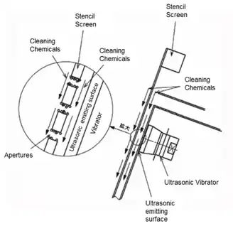 This is a method to soak the entire stencil into the cleaner and irradiate ultrasonic, where cavitation occurs when ultrasonic is irradiated into the cleaner. Although it varies on the size of the stencil, the more initial volume of cleaner in the tank, the closer attention is required on designated volume control of the hazardous cleaners. Oscillation of the stencils is necessary to make up the difference in cavitation impacts in the cleaning tanks in order to maintain consistent cleaning performance. Another possible concern is that the ultrasonic is likely to impact parts that do not require cleaning, including aluminum frame, aluminum tape and adhesive.