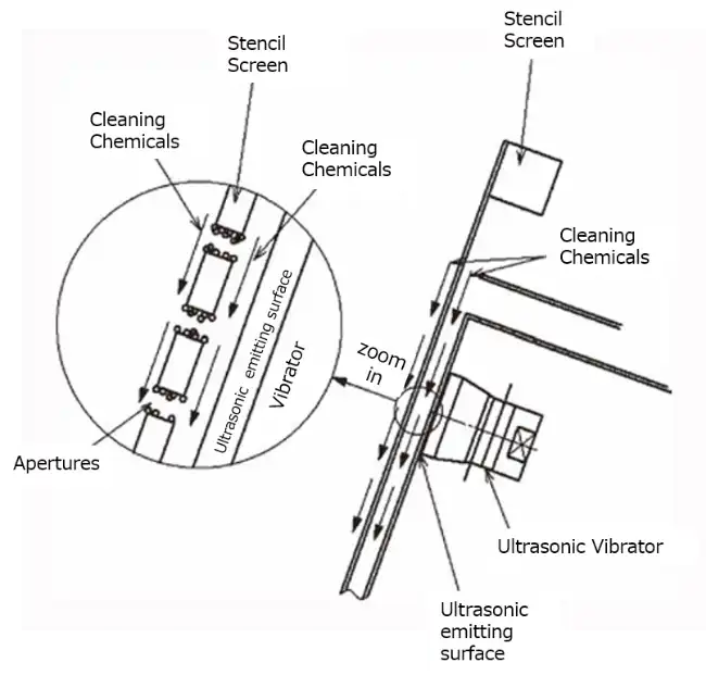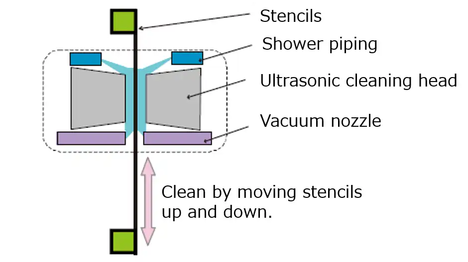On the other hand, in the "direct propagation method" in which ultrasonic waves are directly applied to a metal mask proposed by SAWA Corporation, ultrasonic vibrations are directly transmitted to the mask through a cleaning agent that flows thinly on the mask surface to perform cleaning (FIG. 1). The amount of the cleaning agent to be used can be kept small because only the amount of the cleaning agent to be flowed over the necessary portions on the front and back sides of the mask is sufficient. In addition, by utilizing the difference in the transmission speed of the ultrasonic vibration for each substance, a micro crack is generated on the resin adhering material side at the interface between the mask and the solder paste and the adhering material is peeled off and removed by the penetration of the cleaning agent into the resin adhering material side. Therefore, the mask is hardly damaged, and the mask can be cleaned with high accuracy without unevenness even with respect to the fine mask opening.
