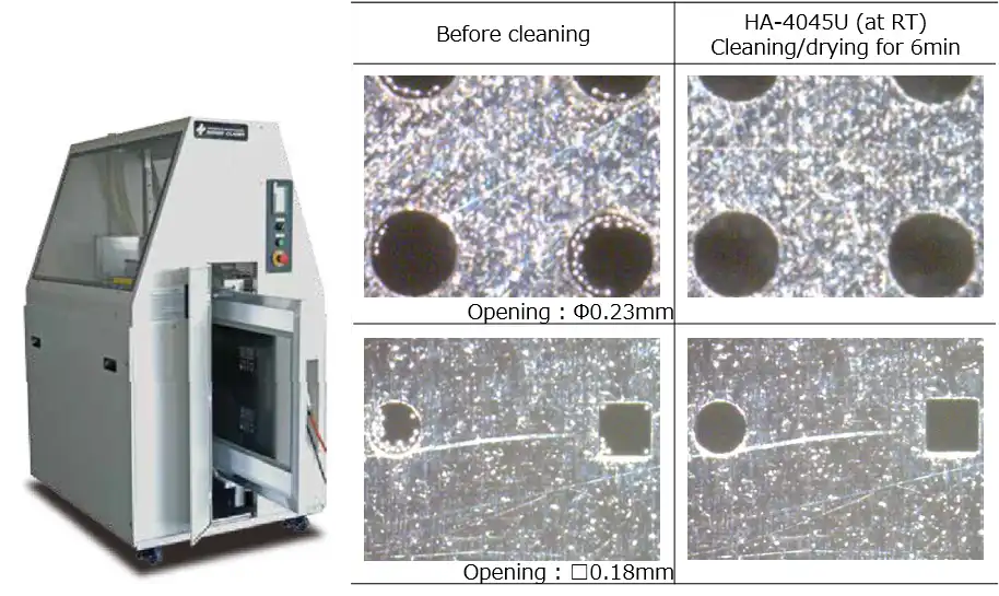 By combining HA-4045U and a SC-AH100-LV specialized for use in ultrasonic cleaning, a series of processes from cleaning to drying can be performed in about 5 to 6 minutes per plate even for masks to which lead-free solder is attached.