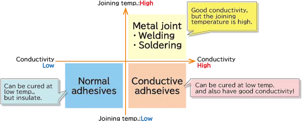 | Metal joints, such as welding and soldering, have good electrical conductivity, but the joining temperature is high. Normal adhesives can be bonded at low temperatures, but they do not conduct electricity because they are not electrically conductive (insulated). There's what comes out there: Conductive adhesives! Conductive adhesives can be joined at low temperatures and also have good conductivity! Combines advantages of metal bonding with as of general adhesives. | |