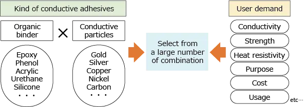 | There are many kinds of organic binders as adhesives and conductive particles to be blended, and so many conductive adhesives are developed and sold on the market. The user should select a conductive adhesive in consideration of performance, application, cost, usage, etc. | |