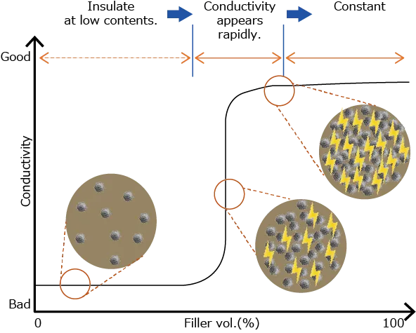 | The graph below shows the relationship between the amount of conductive particles (silver powder) added and the electrical conductivity. If the amount of conductive particles added is small, there is no conduction, but conductivity appears suddenly when added amount exceed a certain amount. |