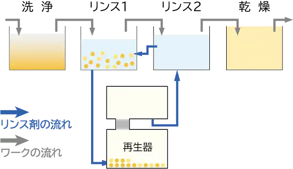 ☆標準装備されたコンパクトな再生器でリンス液が連続浄化・リサイクルされ、高い洗浄品質とともに、廃液レスと低ランニングコストを両立するシステムです。