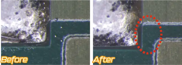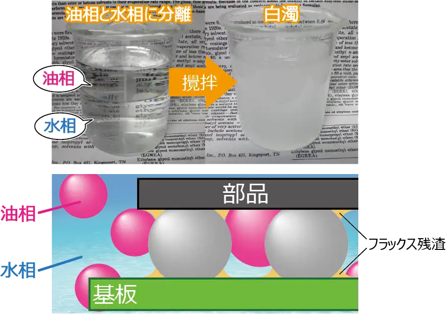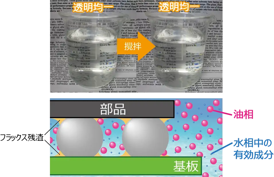 化研テックの従来の低VOC洗浄剤は、油相と水相に相分離する成分が効果的にフラックス残渣を洗浄していました。新開発のマイクロクリン ECO-8100は油相をナノサイズまで微細化し、従来の洗浄剤では洗浄できなかった狭ギャップのフラックス残渣も強力に洗浄します。
