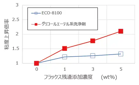 ECO-8100とECO-R81は主剤を共通化しているため、従来の準水系洗浄システムと異なり洗浄剤とリンス剤が無制限に相溶可能である。この設計によって狭ギャップ部品下においても良好な液置換性確保が可能となっている。