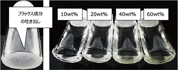 グリコールエーテルと水、洗浄助剤からなる非分離タイプの高含水洗浄剤、及びグリコールエーテル系洗浄剤とECO-8100のフラックス溶解力を比較した外観写真を図9に示す。各洗浄剤に3wt%のロジン系フラックス残渣を添加し、超音波照射にて溶解・分散させた後、液温25℃条件下で静置し外観を確認した。相分離構造を持たない高含水洗浄剤では、フラックス残渣中の主に樹脂成分が液中に溶解しきれずに吐き出され、懸濁と沈殿を生じる(図9 写真右)のに対し、ECO-8100(同左)はグリコールエーテル系洗浄剤(同中央)と同様に懸濁の無い均一透明状態を維持しており、溶解力の違いは一目瞭然である。