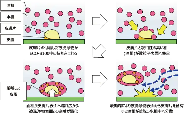 また、ミクロ相分離構造によって水相中に細かく無数に生じる疎水性領域の存在が、あらゆる種類のパーティクル除去に対しても効果的に働くことが分かっている。パーティクルの中でも特に除去が困難な、人体に由来する有機物微粒子(皮脂+皮膚片)に対するECO-8100の洗浄メカニズムを図12に示す。