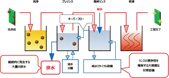 水リンス方式では純水のかけ流しにより、大量の排水が生じることが最大の問題点である。(図3)