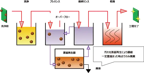 一方でリンス剤にST-05を用いる当社洗浄装置「マイクロクリーナ―」は小型の蒸留再生器を内蔵しており、非共沸系混合液体である含水アルコール ST-05の組成を変化させず安定的な蒸留再生を可能にしている。図4に示す通りプレリンス槽の汚れた液は蒸留再生により清浄な留出液となって最終リンス槽に流れ、汚れは再生器内に濃縮されていく。また、留出液の供給によって最終リンス槽の液面が一定以上に達すると、プレリンス槽へとオーバーフローされる。この繰り返しにより完全にクローズドでST-05はリサイクルされ、高い清浄度を維持し続けることができる。また水リンス方式のような大掛かりな付帯設備は必要なく、濃縮された高濃度のフラックス残渣と洗浄剤成分などの汚れを含む再生器内液のみが廃液となるため、廃液量は水リンス方式とは比較にならないほど少ない。