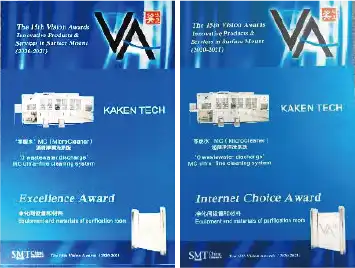 こうした特長が、数々のお客様の製造現場でご好評頂き、ST-05リンスシステムは、国内では準水系に並ぶフラックス洗浄の主流となるまでに市場実績を拡大した。最近では中国において、「SMT China 表面実装技術」が主催する「第15回(2021年) 遠見賞(Vision Awards)」にて、「マイクロクリーナ―」が二つの賞を受賞した。(図5)