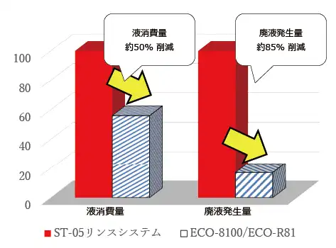 ECO-8100/ECO-R81は何れも成分の約7割が水であり、従来ST-05リンスシステムと同程度の洗浄品質を維持しながら、揮発や乾燥によるVOC総排出量を約半分にまで低減可能である。