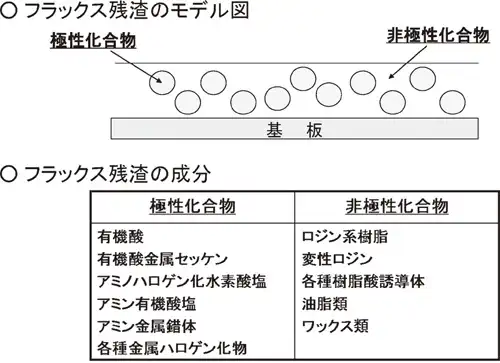 しかし、フラックスは接合金属表面に存在する金属の酸化物、水酸化物、炭酸塩などと化学反応し、金属酸化物、金属錯体、有機酸金属石鹸などの可融・可溶性化合物に変化させ、流動性を与えることにより、はんだとのぬれ性、合金形成を促進する役割をもつ極めて活性の高い材料であること。加えて、露出した金属表面の再酸化を防止するロジン等の樹脂で構成され、これらの化学材料がソルダリング工程で激しく化学反応し、200°Cを超える、有機物にとって極めて高温下に晒されてフラックス残渣が生成される。これらのフラックス残渣をプリント回路板に残し、回路設計者が狙う安定した電気特性、回路定数を維持できるとは考えにくい。また、接合金属表面の酸化状態も部位や材質により異なる上、熱伝導度の低い樹脂部品が色んな形態で接合付近を囲っており、ソルダリング時の加熱状態の差異もあり、フラックス成分を全て完全反応させることは困難である。更に、近年の鉛フリー化によるソルダリング温度の高温化でフラックスの活性を持続するために活性度を高めざるを得ない。また、ハロゲンフリー化により、微量で活性が強かったハロゲン成分に替わり、活性の低い有機酸等の活性剤成分の配合量を増やしており、フラックス残渣の電気特性をプリント回路板の絶縁材料の水準に維持することは極めて困難である。
