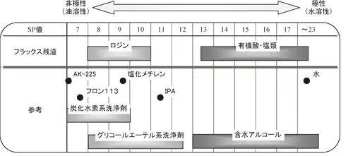②極性や溶解度パラメーター(SP値)が大きく異なる複合成分であるフラックス残渣に対する広範囲な溶解性をもつこと(図6.2.2)。