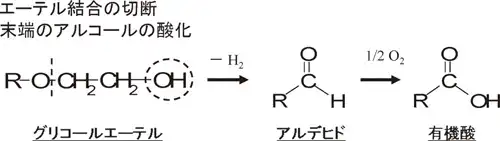 グリコールエーテルの問題は、高温下で酸化分解しやすい点である。特にフラックス洗浄剤として用いた場合、フラックス中の有機酸との共存下で酸化分解が促進され(図6.2.3)、蟻酸などの有機酸が生成し、これが更に分解を加速する4)。また有機酸の発生は、プリント回路板上の金属腐食やマイグレーションなどの品質不良を引き起こすため、グリコールエーテルを用いる場合、最適な酸化防止剤を配合し、通常の使用環境では酸化分解しないよう洗浄剤設計する必要がある。