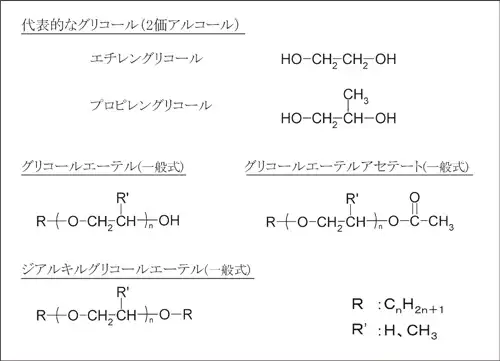 一般的にエチレングリコール系は比較的臭気が低く使用実績も多い。しかし、低沸点の一部のエチレングリコール系については、生体内で代謝したときの生殖毒性、催奇性などが懸念され4)、作業環境での許容濃度が厳しく規制されているものや、PRTR法に該当するものがある(表6.1.1)。プロピレングリコール系は臭いがやや強いものの、生殖毒性や催奇性等の毒性がエチレングリコール系と比較すると低いため需要は増大している。ジアルキルグリコール系は溶解力が他の2種と比べると高く、低臭気であるが、比較的高価なため溶解助剤として用いられる5)。