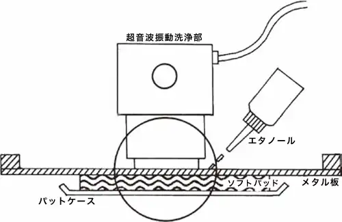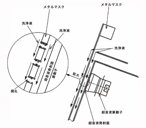 超音波をメタルマスクに直接当てる方式は、マスクの表裏に洗浄剤をかけ流し、液膜を介して超音波振動をマスクに伝え、洗浄を行なう。使用する洗浄剤は、マスクの表裏全体にかけ流す量だけで済むので、少なく抑えることができる。また超音波は、距離に反比例し減衰する特性があるが、直接マスクに超音波を照射することで、距離による影響をなくすことができる。そのため出力を抑えても超音波の効果が得られ、浸せき式超音波方式と比較して半分以下での出力でも洗浄効果が得られる。加えてマスクへのダメージを低減することができると共に洗浄剤の消費量と電力消費を削減でき、ランニングコストを抑えることが可能である。
